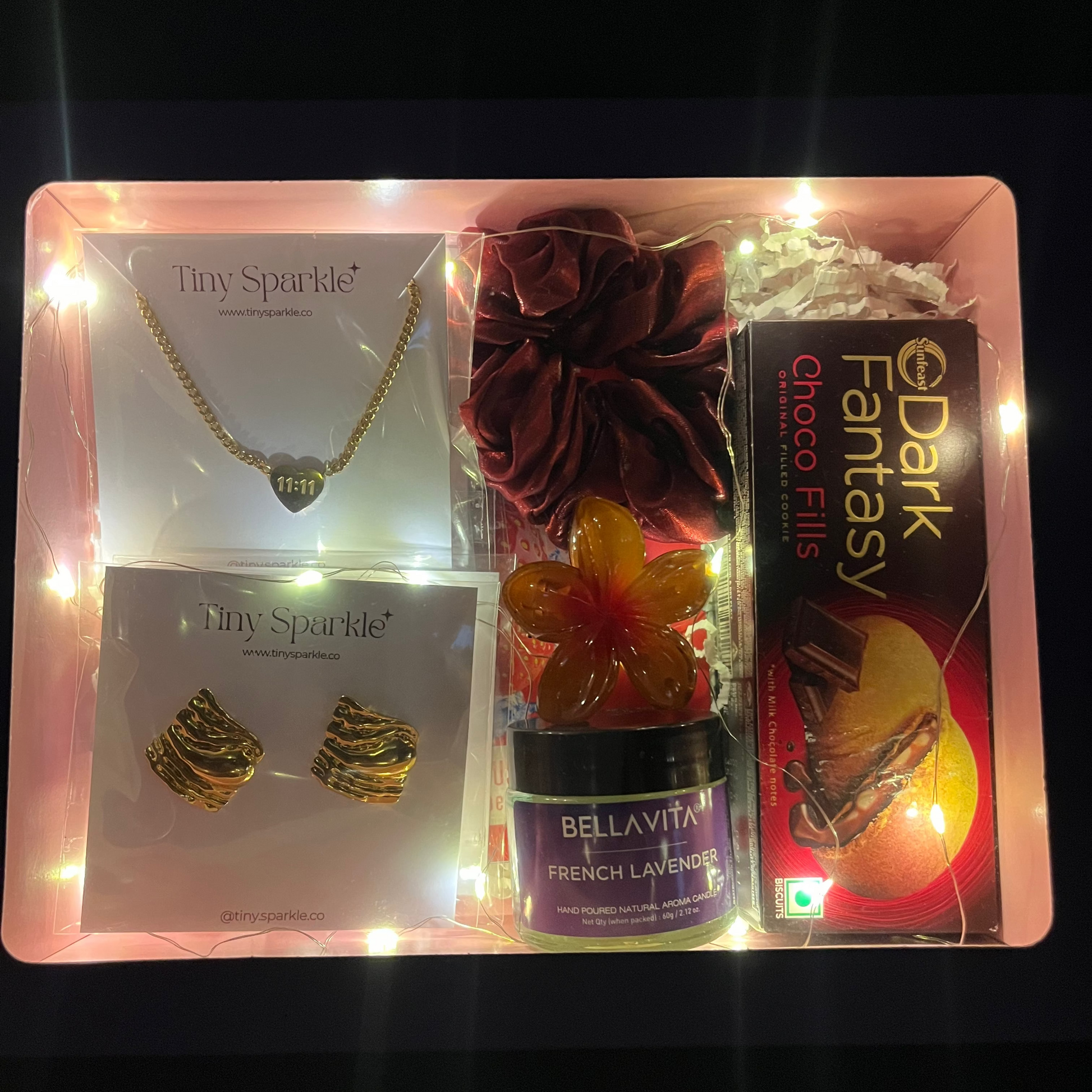 Elevate her birthday celebration with this premium indulgence. This lavish hamper is packed with a wide array of statement jewelry, a complete set of hair accessories, aromatic candles, and a double dose of decadent chocolates for a truly memorable gift.